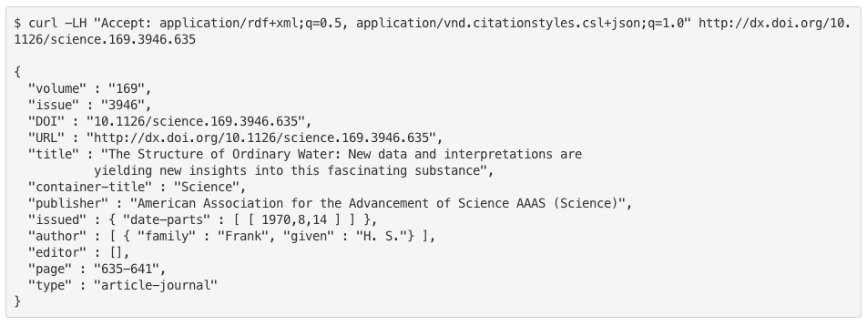 Shown below is an Accept header for the content negotiated request, listing both "application/citeproc+json" and "application/rdf+xml", and the metadata returned by the metadata service. The requesting client wishes to receive citeproc JSON if it is available, but can also handle RDF XML if citeproc JSON is unavailable. A preference level ("q" factor) is used in the request to specify the preferred choice.