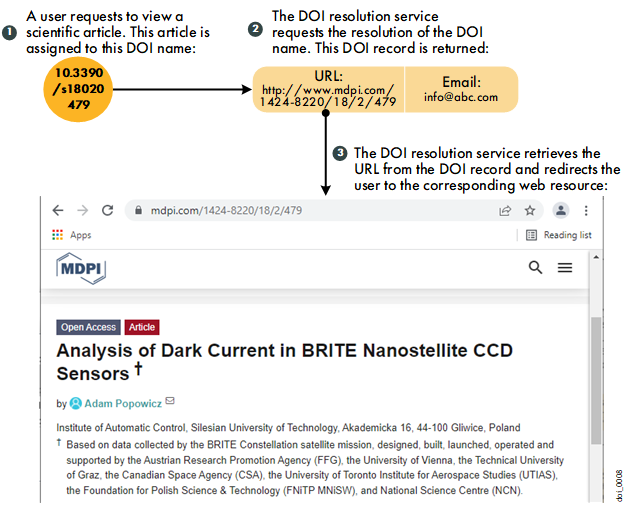 The most common resolution function of a DOI name returns a single web address (or URL for Uniform Resource Locator) to which the user is redirected as illustrated below. This is done by using the HTTPS Proxy Server of the DOI System (https://doi.org). With the DOI Proxy, users can resolve DOI names from any standard web browser by using the URL syntax (A proxy server is a web server that understands the Handle System protocol, thereby acting as a gateway between the Handle System and HTTPS.). For example, the resolution of the DOI name "10.10.123/456" would be done from the address "https://0-doi-org.oasis.unisa.ac.za/10.123/456". That makes the DOI resolution service extremely easy to use.