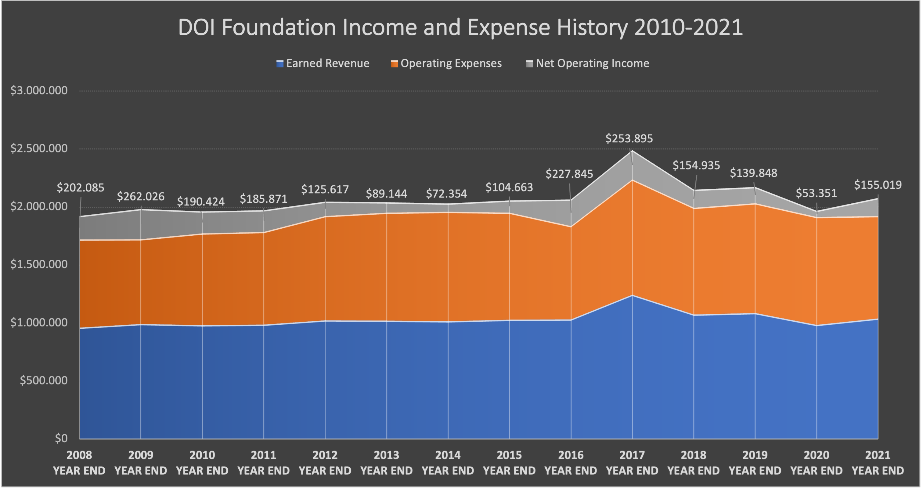 Each year we strive to generate a small net operating income and have been able to do so nearly every year. Below is an overview of how this has changed over time.